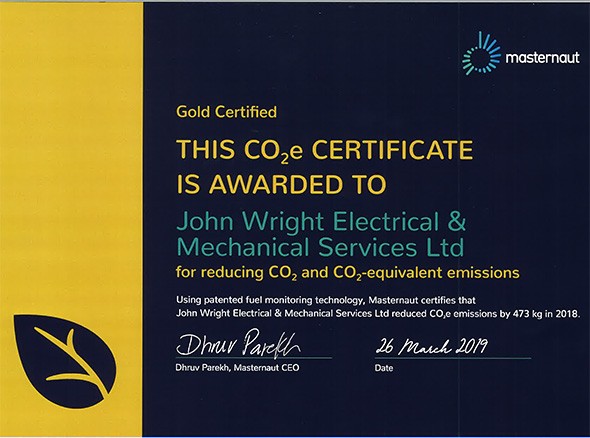 John Wright Electrical is proud to announce that we’ve received a Gold certificate for our fleet’s fuel efficiency! This is a great achievement for our business, considering the environmental issues our planet now faces.